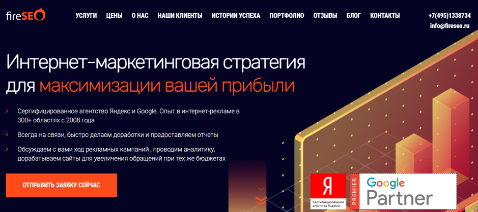 Друзья, позвольте вспомнить и о себе. Главная страница нашего агентства интернет-маркетинга – отличный пример эффективного CTA: