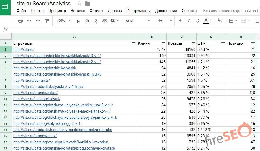 Получаем готовую информацию по каждой странице: Клики, показы, CTR, Позиция.