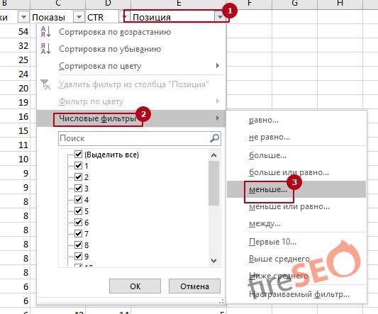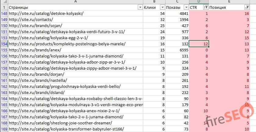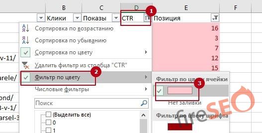 - Далее фильтруем по цвету оба столбца – CTR, позиция.