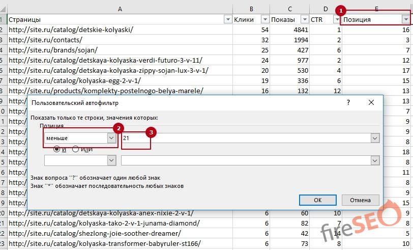 - Фильтруем столбец позиция – меньше 21, чтобы работа с улучшением CTR принесла максимальный эффект.