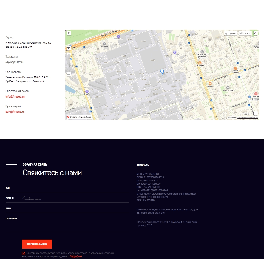 Страница с контактами должна содержать полные данные о компании, а не только форму обратной связи. Указывается такая информация: