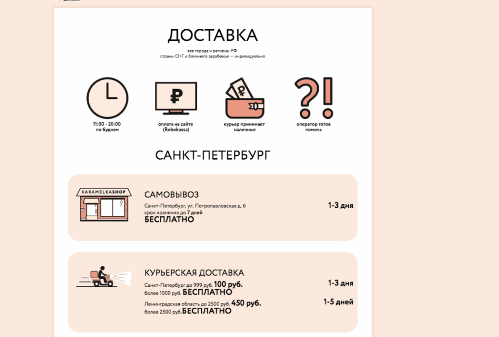 Обычно информация об условиях оплаты и доставки предоставляется в отдельных разделах. Способов оплаты должно быть как минимум три, причем важно подробно объяснить, как ими воспользоваться. На основе данных статистики отметим, что 40% пользователей уходят с ресурса, не найдя удобного для себя способа.