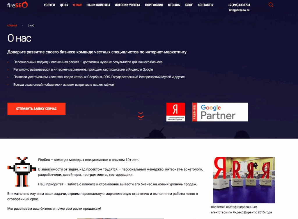 Общих данных, представленных на главной странице, зачастую недостаточно, чтобы вызвать доверие к бренду. Для повышения лояльности рекомендуется создать отдельный блок, в котором будут описаны история компании, предоставлена информация о сотрудниках. Преимуществом будут: