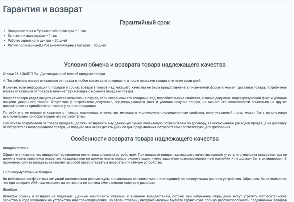 На сайте необходимо предоставить информацию о том, что делать, если клиент остался недоволен услугой, не подошел товар. Достаточно описать условия возврата средств. Длинный текст не нужен.