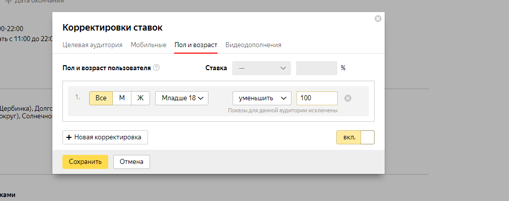 3. Исключили показы лицам младше 18 лет, для экономии бюджета клиента: