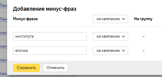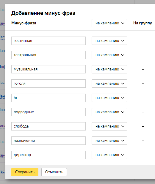6. Проанализированы списки поисковых запросов пользователей и на основе этих данных добавили новые минус-слова в кампанию Yandex.Direct:
