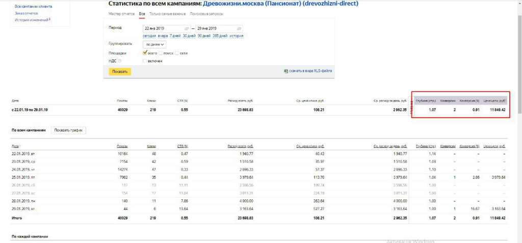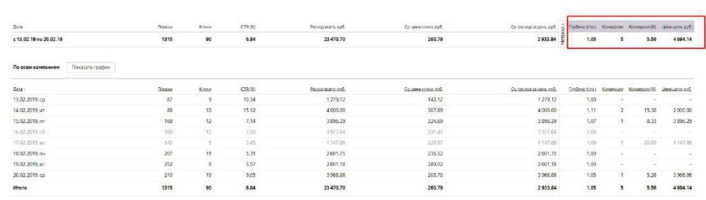 Сравнивая результаты за одинаковый период “до” и “после” оптимизации, уже через неделю видны результаты и кратные увеличения показателей эффективности рекламной кампании. Хоть это слишком короткий период, чтобы делать какие-то кардинальные выводы о результативности правок, но сигнал о нашем движении в правильном направлении явно заметен. А вот показатели в цифрах: Количество кликов до оптимизации составляло 219, а после — 90; Количество заявок было до 2-х, после стало приходить 5 и более; Конверсия до доработок — 0.91%, после — все 5.56%; Цена конверсии до правок — 11 849.92 руб., после снизилась до 4 694.14 руб.