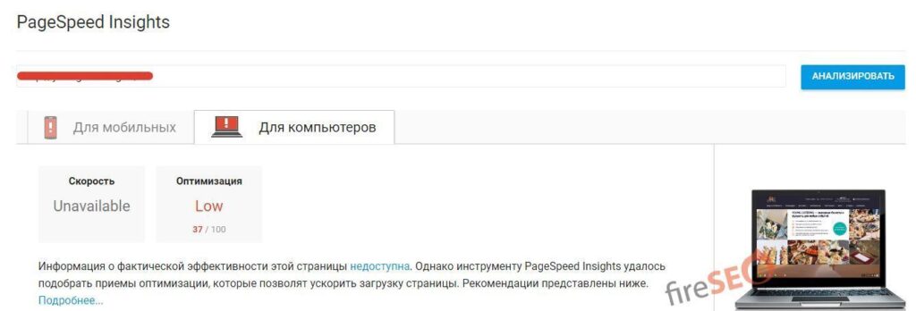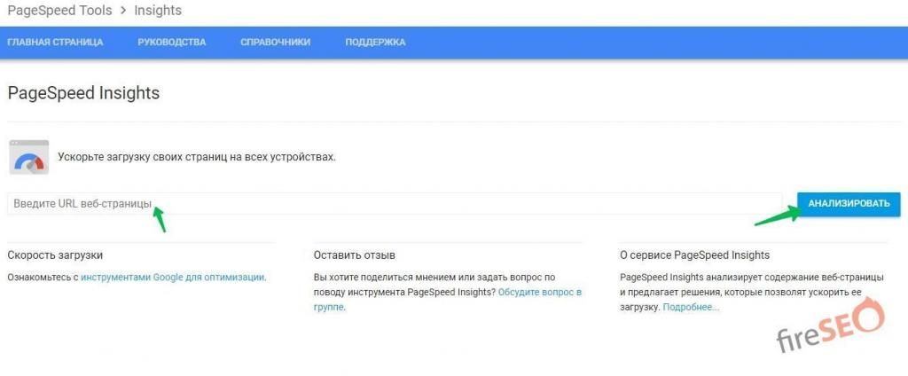 Чтобы оценить время загрузки страниц на всех устройствах, заходим в PageSpeed Insights, вводим свой URL и жмем на кнопку «анализировать»: