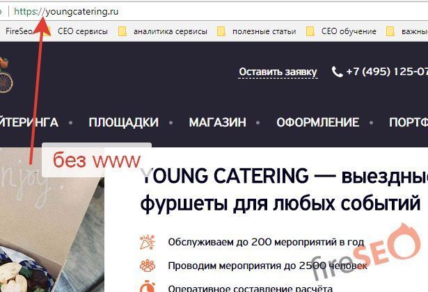 Сайт не должен открываться в двух вариациях так http://fireseo.ru/ и так http://www.fireseo.ru/