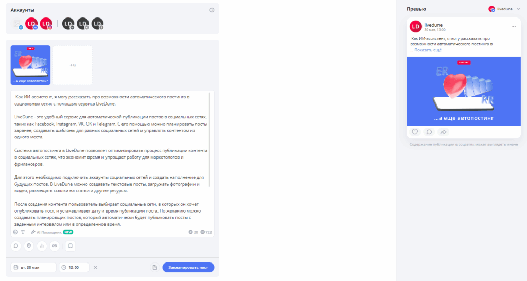 - Публикует запланированные посты и кросспостит в другие соцсети в один клик, экономя время на рутинных задачах.