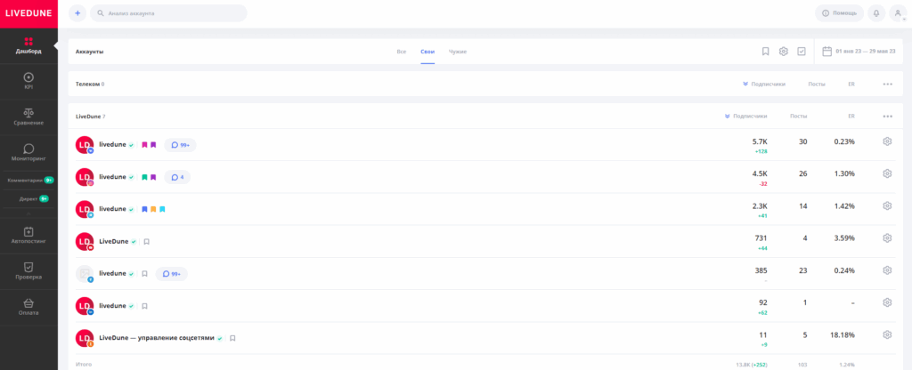 - Аналитика по собственным аккаунтам изо всех соцсетей в одном месте.
