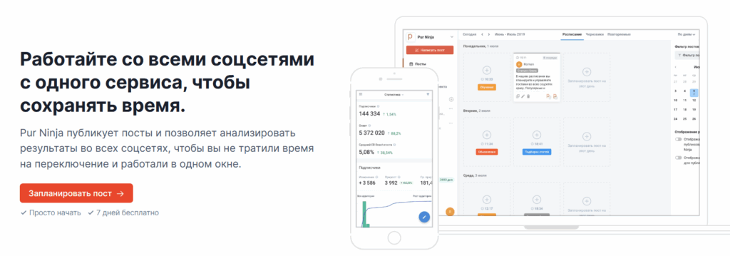 Pur Ninja — сервис для автопостинга в социальные сети и анализа результатов. Поддерживает ФБ, LinkedIn, Инстаграм, Твиттер, ВК, Телеграм, Одноклассники.