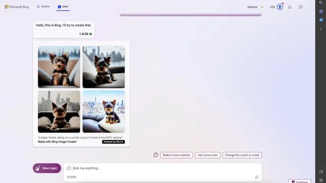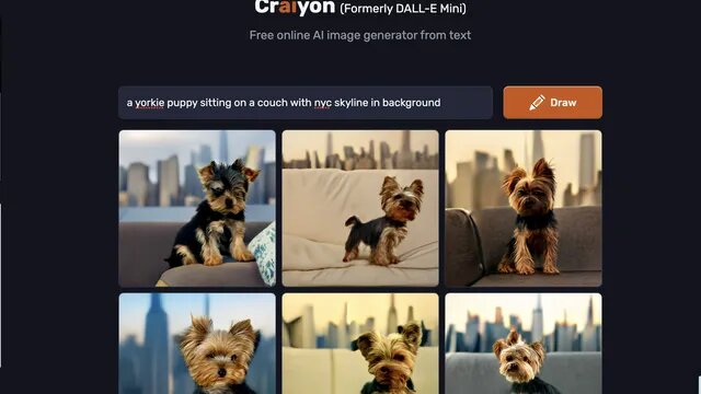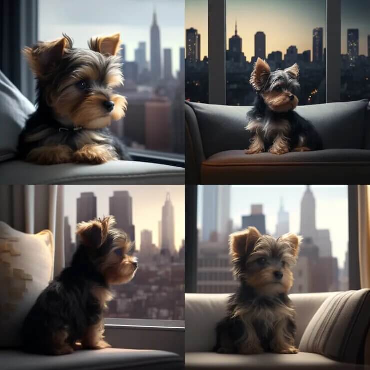 Чтобы испытать генераторы на качество, мы ввели один и тот же запрос a baby Yorkie sitting on a comfy couch in front of the NYC skyline (щенок йорк, сидящий на удобном диване перед горизонтом Нью-Йорка) и приложили скриншот для вашего удовольствия.
