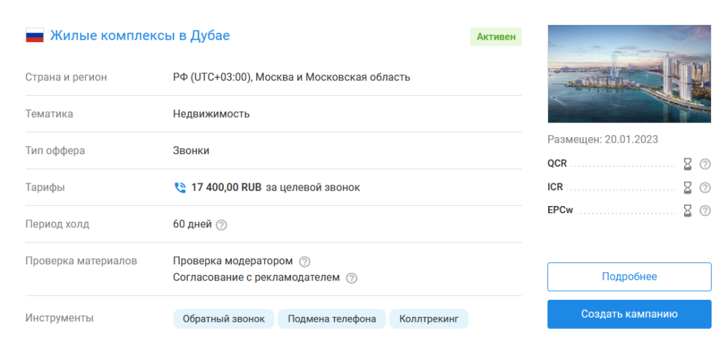 Особенность этой партнерки в том, что рекламодатели предлагают оплату за звонки. Офферы тоже не привычные — здесь много российских ЖК, есть предложения по недвижимости в Дубае, автосалоны известных брендов, а под американский трафик можно найти программы по высшему образованию, ремонтным работам, дизайну, проведению домашнего интернета, и много других.