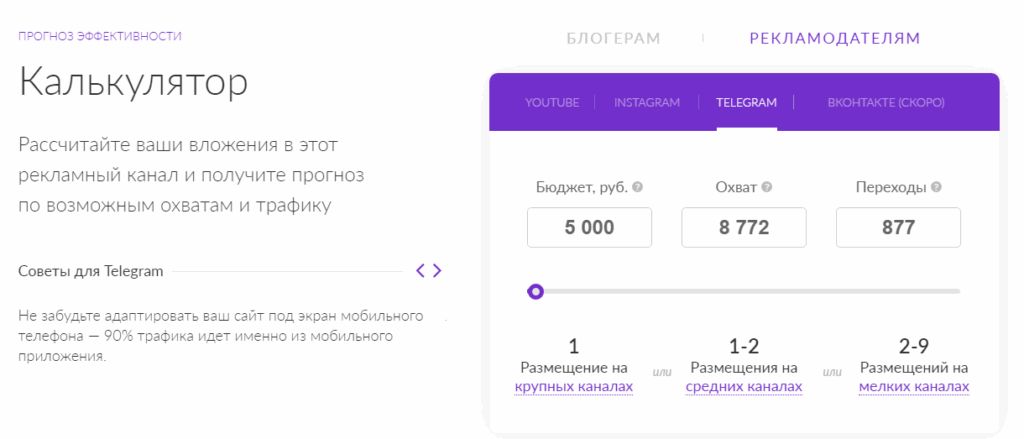 Чтобы воспользоваться всеми возможностями биржи, необходимо приобрести PRO-доступ стоимостью 4999 руб. Есть и комиссия, но ее биржа берет с блогеров. На сайте есть калькулятор эффективности, в котором вы сможете рассчитать рекламную отдачу.