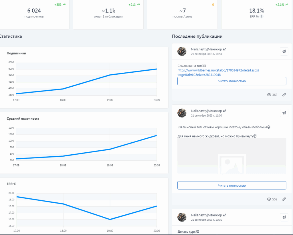 На отдельной странице находится информация о стоимости размещения и возможности использовать взаимопиар. Представлены графики изменения аудитории, среднего охвата поста, ERR. Также на странице видны последние посты из ленты, благодаря чему можно сразу же ознакомиться с каналом, со стилем изложения и качеством контента.