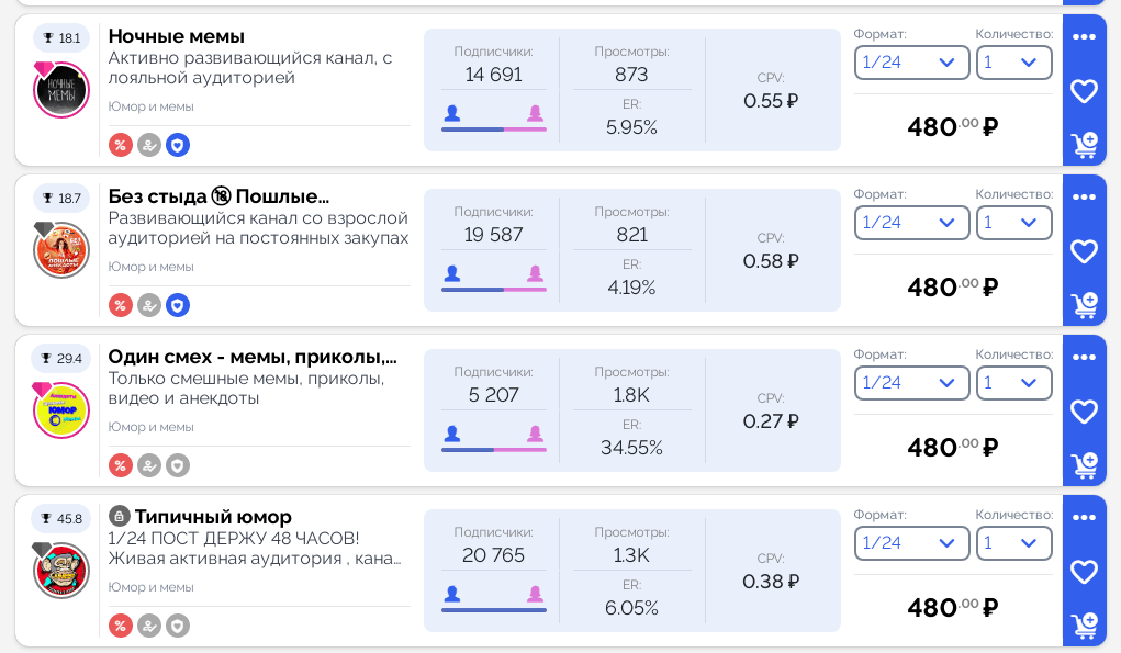 В этом разделе вы сможете искать каналы для размещения, фильтруя их по кол-ву подписчиков, стоимости рекламы и времени нахождения поста в ленте/топе. Можно переходить на карточку канала, на которой содержится информация об условиях размещения и возможности взаимопиара.