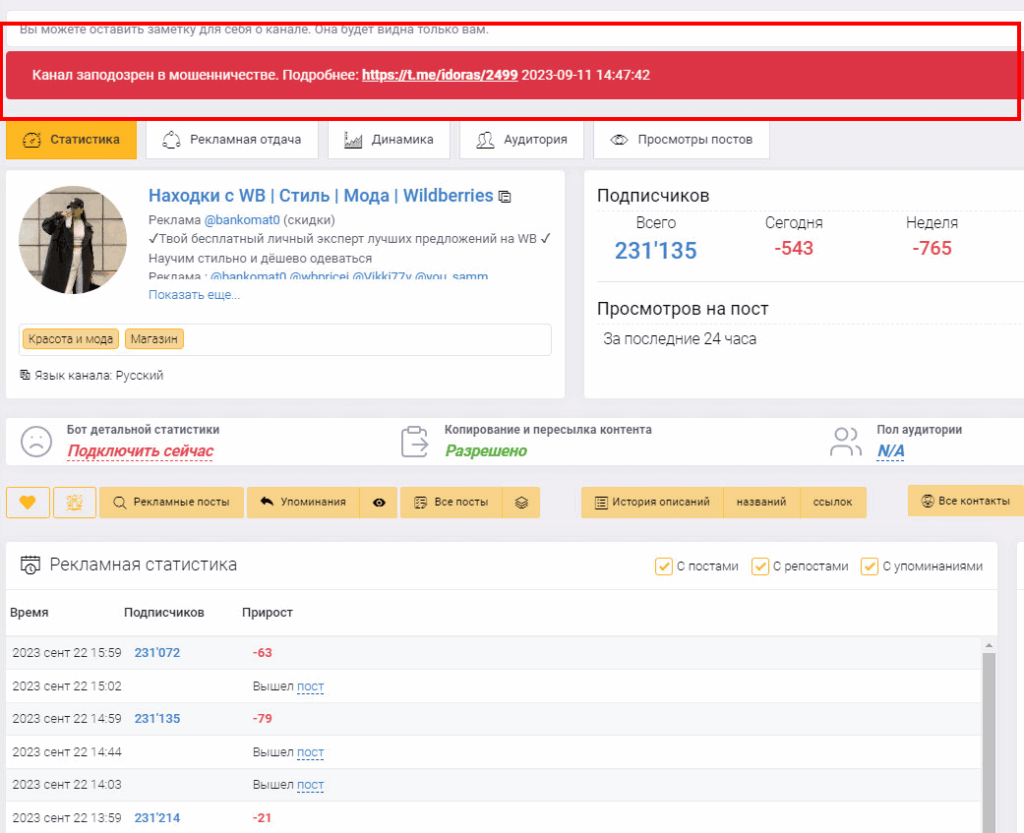 Первое, на что нужно обращать внимание — наличие красной метки. Если она есть, значит, канал использует запрещенные приемы продвижения или мошеннические схемы. Но и отсутствие метки не дает гарантий, что канал не прибегал к накрутке.