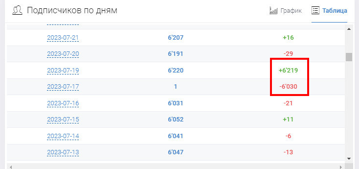 Аномальное изменение кол-ва подписчиков