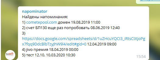 При необходимости, @nopomni_fire_bot выводит список напоминаний: