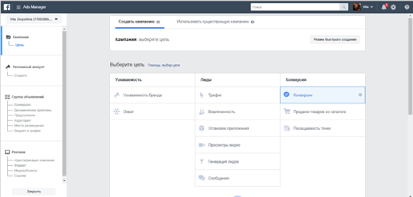 - Настраиваете рекламную кампанию с целью «Конверсия».