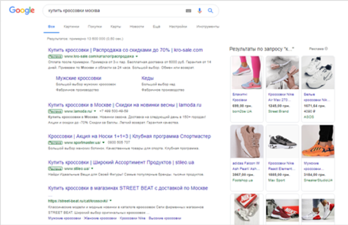 Например, Google Ads, РСЯ. Суть такого продвижения – вы платите поисковым системам за то, чтобы они показывали ваш сайт в ТОП-10 по ключевым словам. Например, клиент хочет купить кроссовки в Москве. Первые 4 запроса – это реклама.