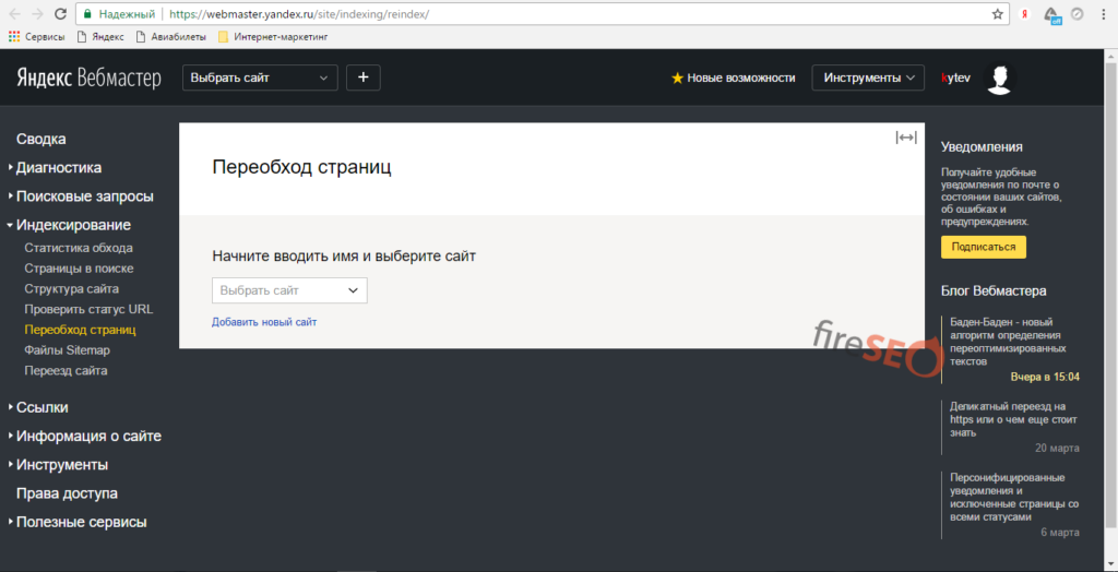 Далее зайдите в раздел “Переобход страниц” Яндекс. Вебмастера и добавьте адреса основных страниц сайта. Вот здесь: