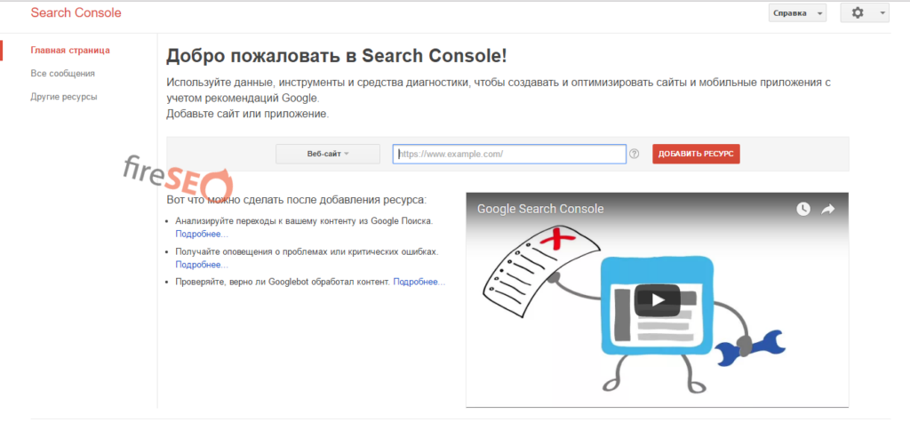 С помощью бесплатного сервиса Google Search Console вы сможете не только добавить свой сайт для индексации в Google, но и оптимизировать его согласно предпочтениям системы, улучшить его для повышения позиций в поиске. Сам сервис довольно простой и понятный в управлении. Укажите url своего сайта в адресной строке и нажмите кнопку «Добавить ресурс», Процедура добавления аналогична действиям в Яндекс. Вебмастер (как, например, с мета-тегами). Google также сам предложит вам следующий список действий, среди которых будет: