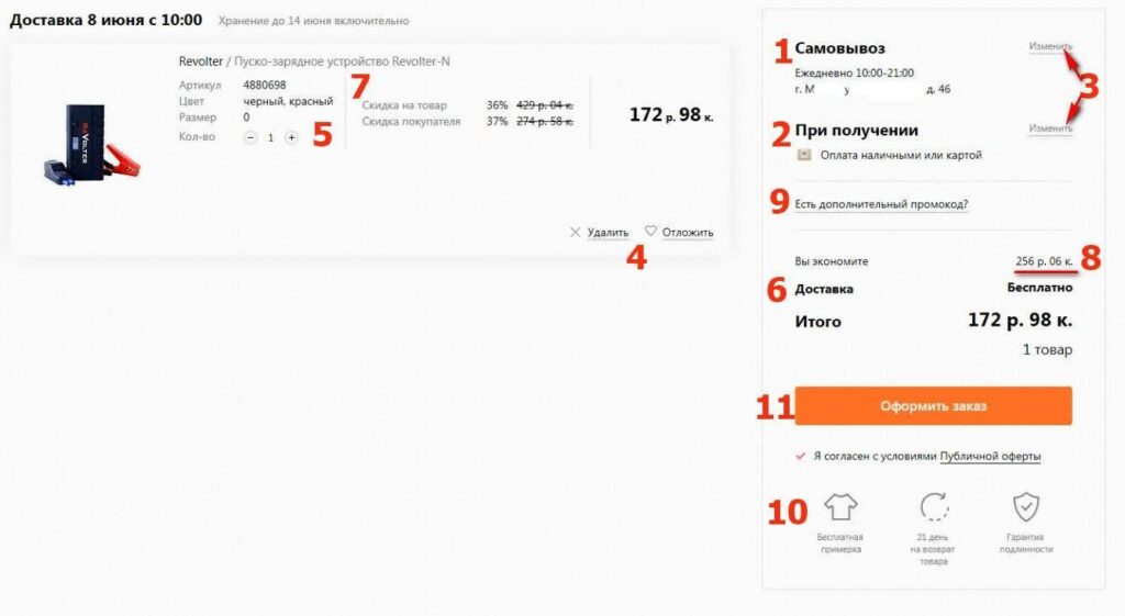 7, 8 – пользователь видит размер скидки и сэкономленную сумму.