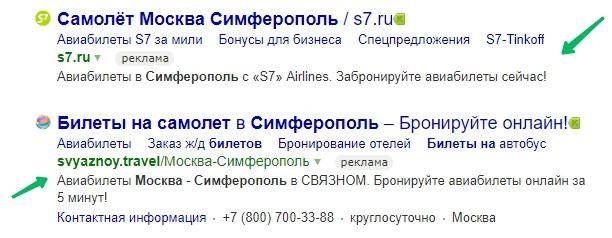 Блок спецразмещение в Яндекс. Директ  располагается сразу же под поисковой строкой, где пользователи вводят интересующие запросы – над результатами органической выдачи. А выглядят объявление в таком блоке следующим образом: