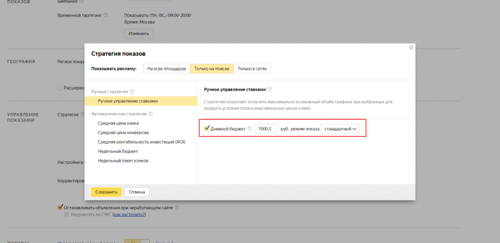 Чтобы не стать жертвой нечеловеческих расходов из-за громадной ставки, ограничьте дневной бюджет в настройках кампании: