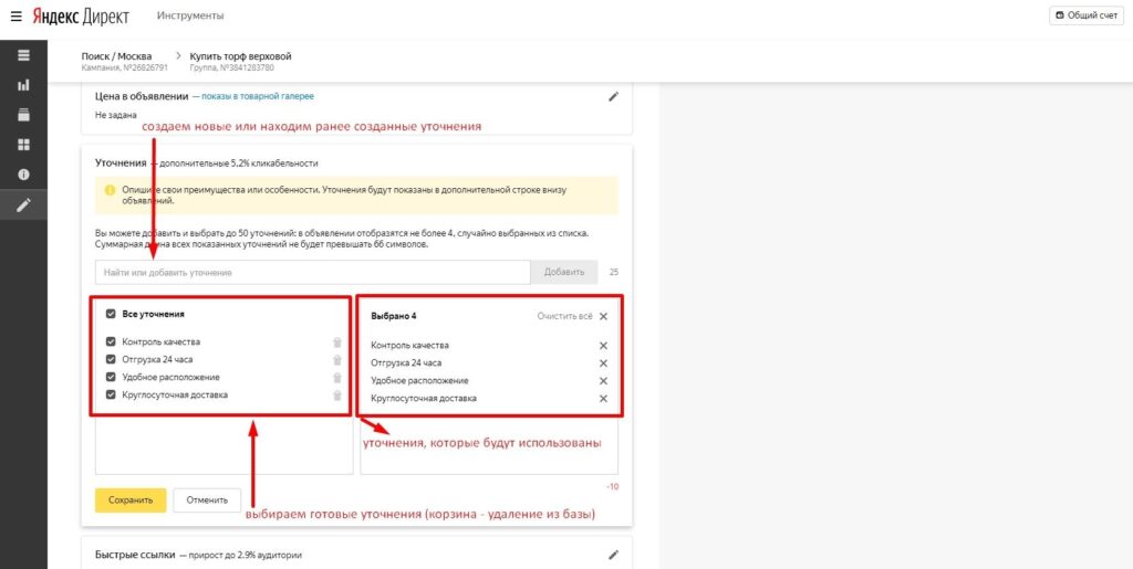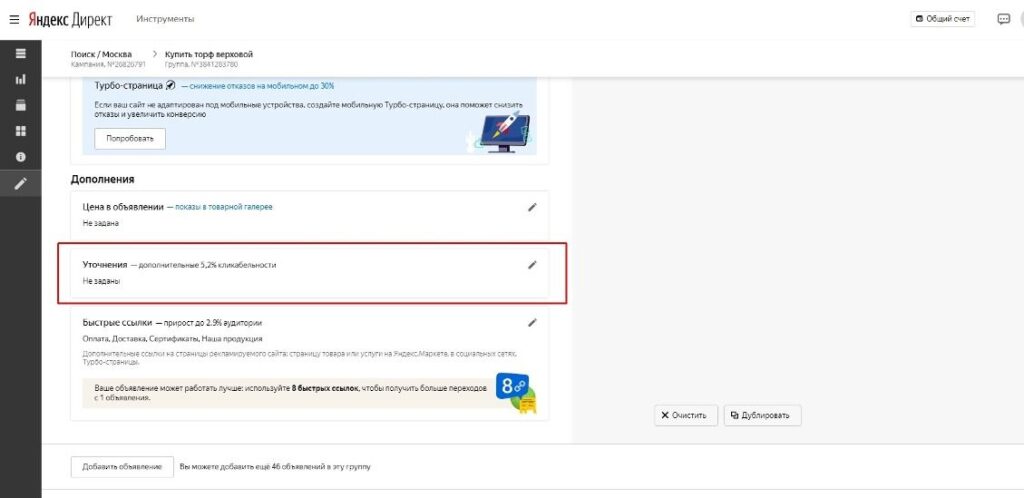 Как добавить уточнения в Яндекс Директ