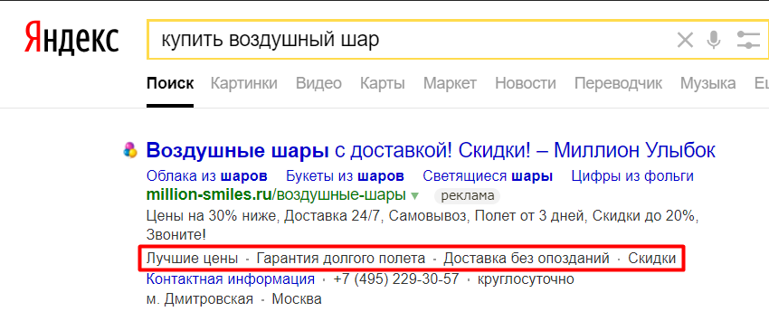 Уточнения в Яндекс Директе — короткие некликабельные тексты, которые показываются как дополнения к объявлениям. Предназначены — для указания дополнительной информации о товаре или услуге. Например, преимущества, особенности, характеристики, информация о скидках и прочее: