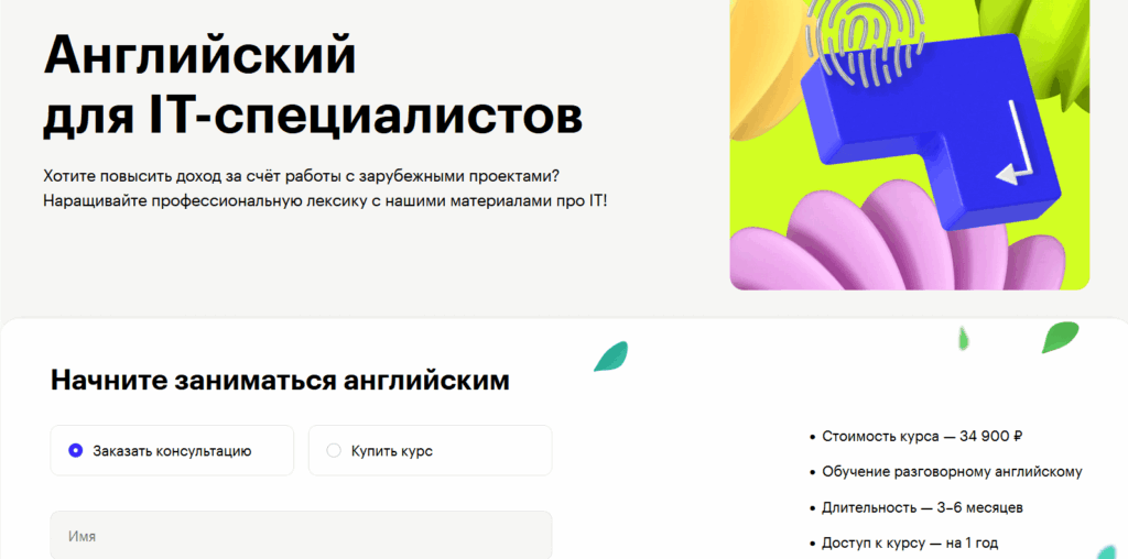 Популярная онлайн-школа проводит курс английского, на котором вы сможете повысить уровень владения языком на на одну ступень. Если достичь цели не получится, то вам предоставят дополнительное обучение бесплатно. Также действуют индивидуальные программы: «для начинающих», «IT-специалистов», «маркетологов» и другие.