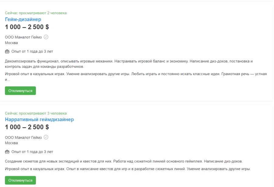 Если зайти на сервис hh.ru, то там можно найти вакансии для геймдизайнеров без опыта с оплатой как от 40 000 руб., так и от 75 000 руб.