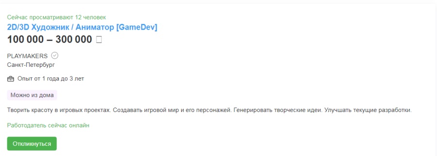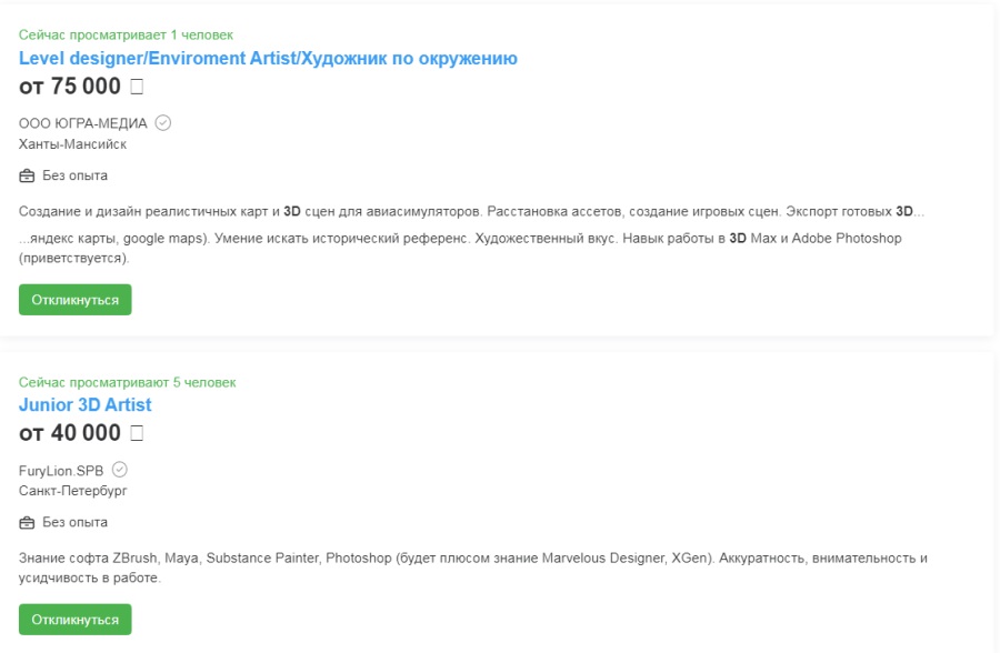 Для 2D/3D-художников с небольшим опытом можно встретить предложения до 300 000 рублей.