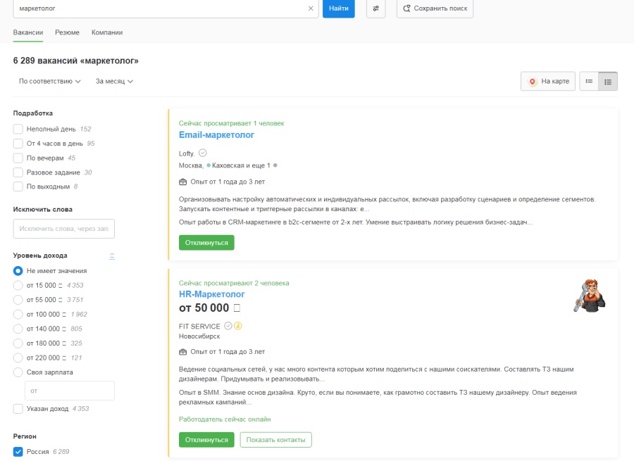 По запросу «интернет-маркетолог» сервис выдает более 800 вакансий, а для digital-маркетологов открывается список из 200+ предложений.