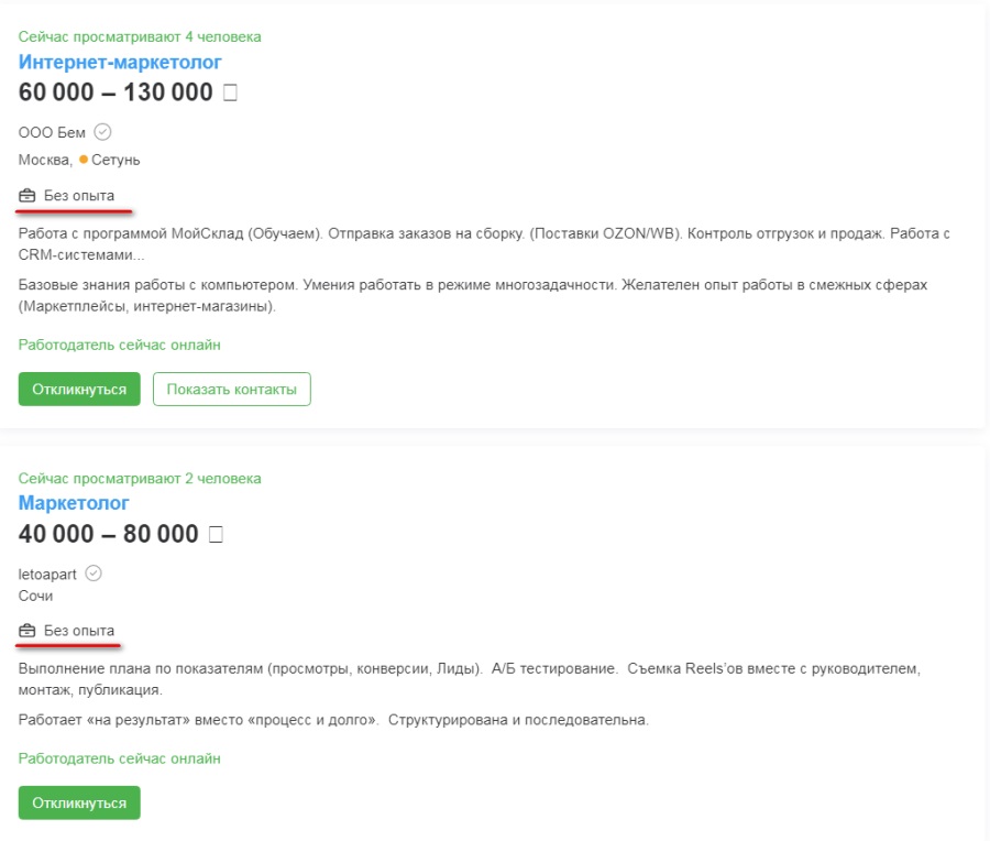 Если посмотреть на данные сервиса hh.ru, то можно встретить предложения для маркетологов без опыта с размером оплаты до 80 000–130 000 руб.