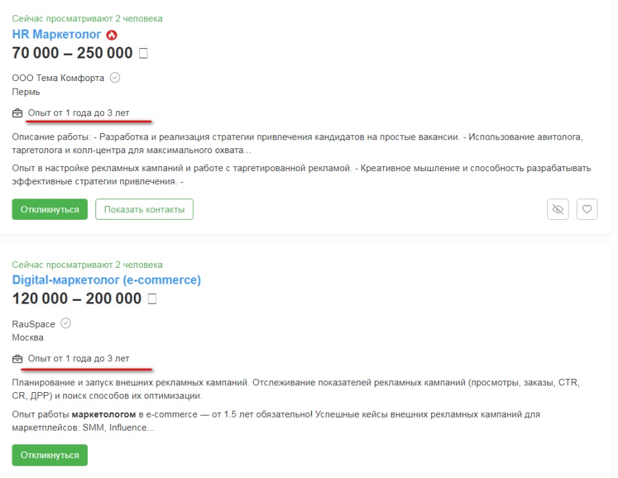 Пример вакансий для специалистов с опытом от года на hh.ru