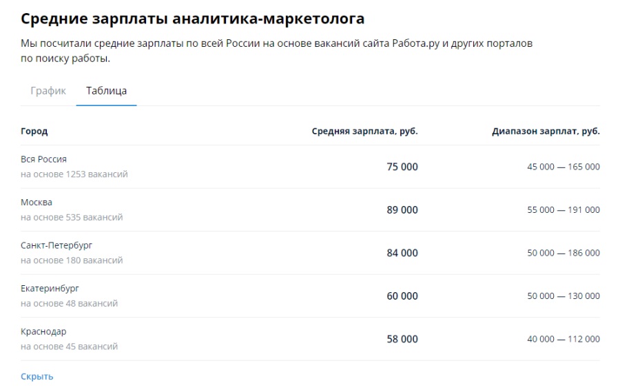 Данные по средним зарплатам аналитиков-маркетологов по данным rabota.ru