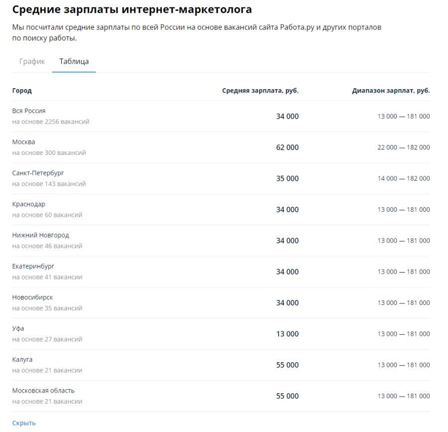 Данные по средним зарплатам интернет-маркетологов по данным rabota.ru