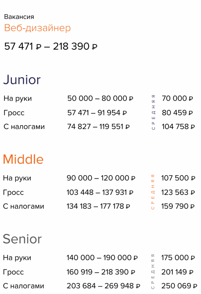 Согласно исследованию рекрутингового агентства RealHR, средняя ЗП Junior-дизайнера составляет 80 459 руб., специалиста уровня Middle — 123 563 руб., а Senior-дизайнера — от 201 149 руб. Минимальную и максимальную ЗП (согласно исследованию) можно увидеть во втором столбце на изображении ниже: