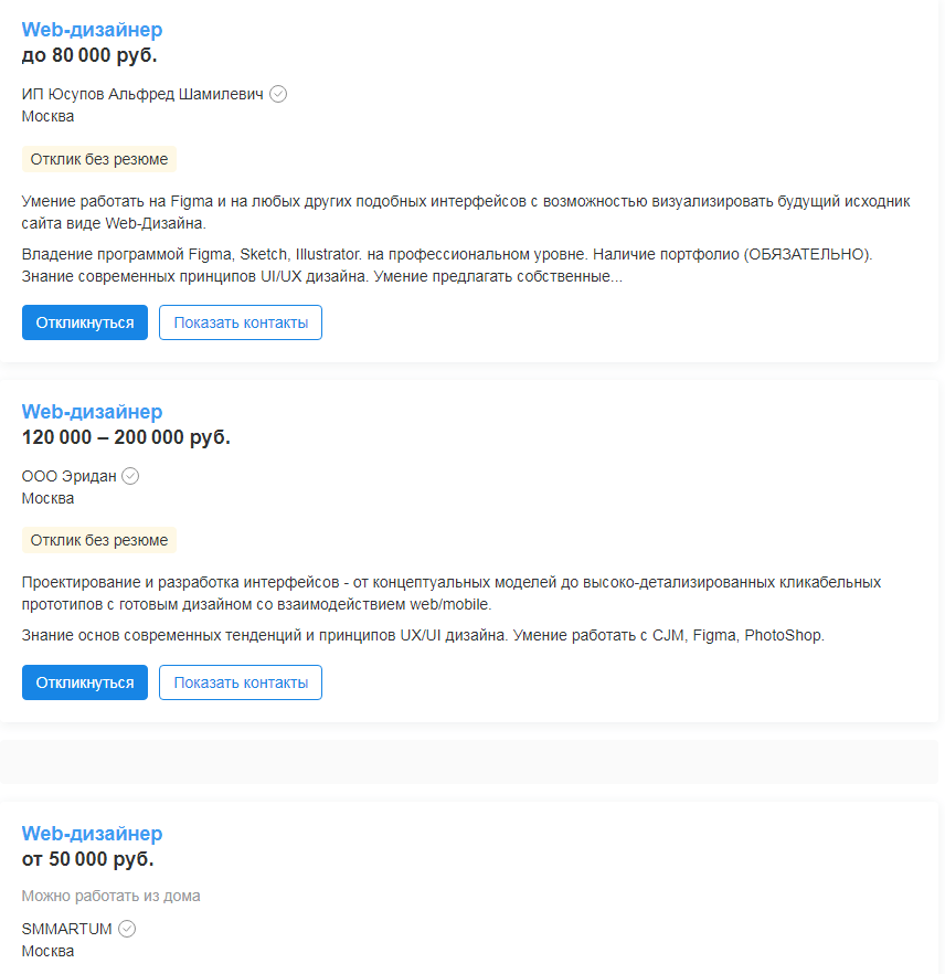 Скриншот вакансий с hh.ru
