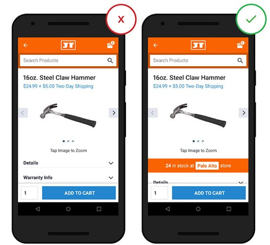 Наличие в физическом магазине является ключевым фактором для пользователей, которые хотят купить или забрать товары в оффлайн магазине. Всегда старайтесь определять местоположение пользователя автоматически, чтобы показать локальную доступность, но предоставьте возможность легко выбрать предпочтительный магазин. Распространенной ошибкой является задание местоположения по умолчанию без простой возможности переопределить его.