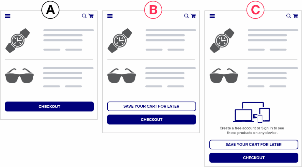 Варианты B и C предлагают не только оформить заказ, но и сохранить содержимое корзины и отложить покупку