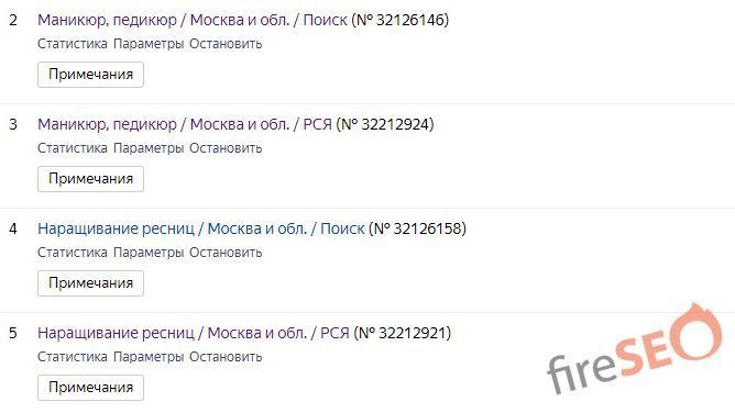 Дальше мы разбили рекламную кампанию на Поиск и РСЯ. Разделили кампании по типам услуг школы – чтобы привлекать аудиторию, которая хочет учиться дизайну ногтей, аппаратному маникюру/ педикюру или освоить технологии наращивания ресниц: