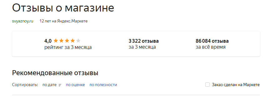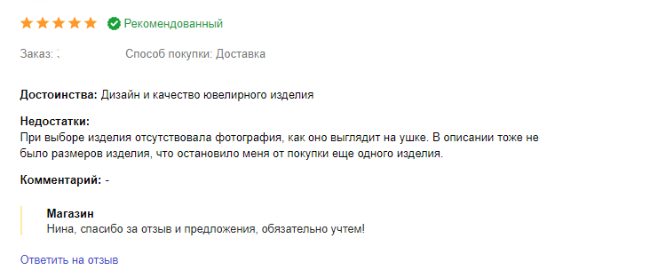 Пройдя модерацию, отзыв получает статус рекомендованного (они предусмотрены только для магазинов). Другие отзывы отображаются внизу страницы, под рекомендованными.