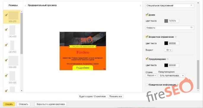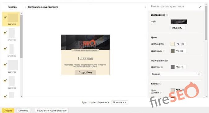 В этом Конструкторе вы можете самостоятельно создать привлекательные графические объявления по предложенным шаблонам или на основе своего сайта, при этом – бесплатно и неограниченное количество раз. Конструктор обещает разработать объявление без помощи профессиональных дизайнеров в течение нескольких минут. Убеждаемся в этом сами, вставив адрес нашего сайта fireseo.firedemo.ru/ в строку для создания креативов: