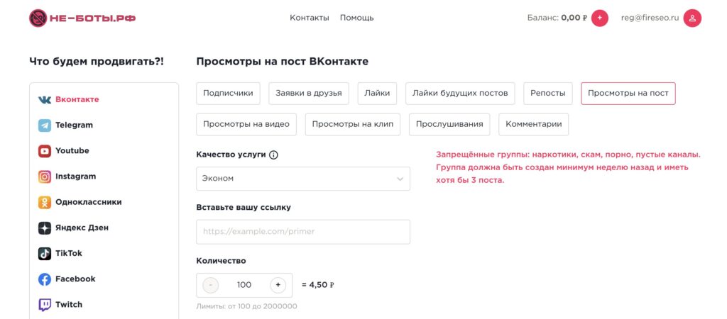 НЕ-БОТЫ.РФ – сервис с довольно высокими ценами, но лучшим, по нашему мнению, качеством услуг. У сервиса практически нет тарифов с «ботами», потому они специализируются на накрутке именно живых пользователей. Цены на просмотры в Телеграм здесь начинаются от 0,05 ₽.