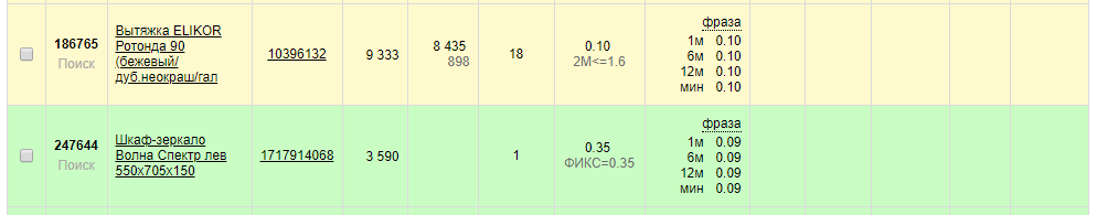 Желтый цвет свидетельствует о том, что установлена ставка ниже минимальной. Белый – признак отсутствия настроек для данного товара. Зеленый — всё настроена отлично, ставка соответствует цели.